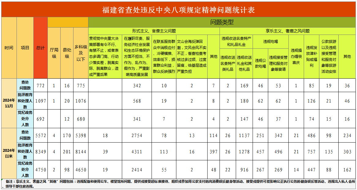 2024年11月,福建省查处违反中央八项规定精神问题772件,批评教育和处理1097人,给予党纪政务处分692人。福建省2024年以来查处违反中央八项规定精神情况如下: