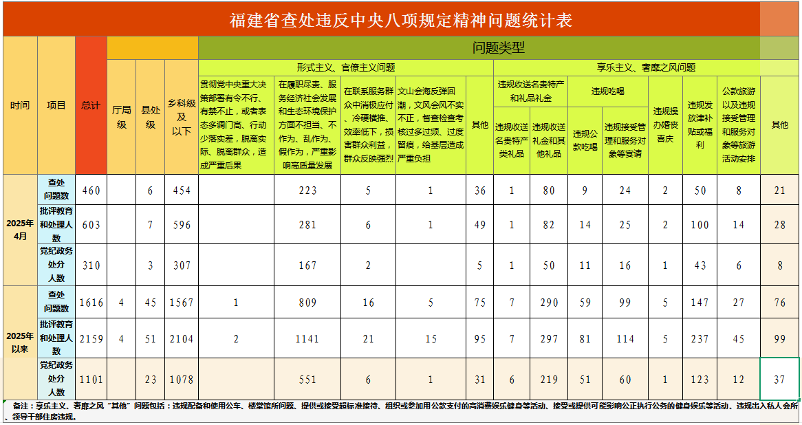 2025年4月,福建省查处违反中央八项规定精神问题460件,批评教育和处理603人,给予党纪政务处分310人。福建省2025年以来查处违反中央八项规定精神情况如下: