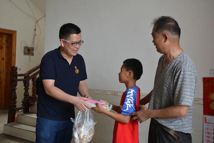 林国洪(左一)到贫困户家给孩子送上课外书及学习用品