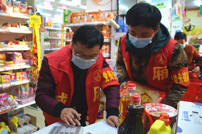 罗斌(左)和同事到驻点村超市为居家隔离的群众采购生活物资
