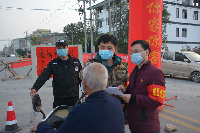 罗斌在疫情防控一线驻点村路口对进出人员健康状况进行登记