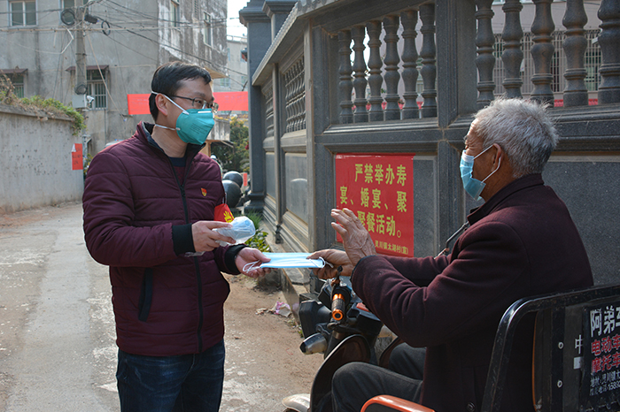 罗斌向驻点村群众宣传疫情防控知识并赠送口罩